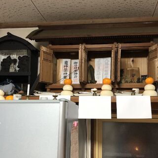 2段の鏡餅、尾頭付きイワシ、御神酒、蝋燭