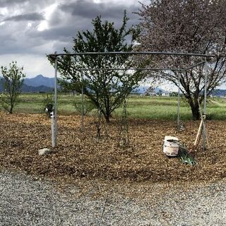 頑固社長は、防草用に木のチップを蒔いたり、ブドウのつるを誘引したりした。