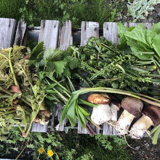 本日の成果 ➀ちょっと伸びたタラの芽 ②こごみ ③アマドコロ ④イラ ⑤山ワサビ