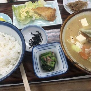 「豚汁には、大きいナメコ、多種の野菜、もちろん豚肉も」