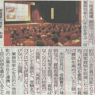 2019年2月21日 信濃毎日新聞 諏訪市で開催された改善研修会にて、赤田社長が全社員の技能検定への取り組みについて講演しました。 前の記事 次の記事 コメント コメントする コメントの投稿 コメントの返信 コメント (スタイル用のHTMLタグを使えます) 名前 電子メール URL サインイン情報を記憶